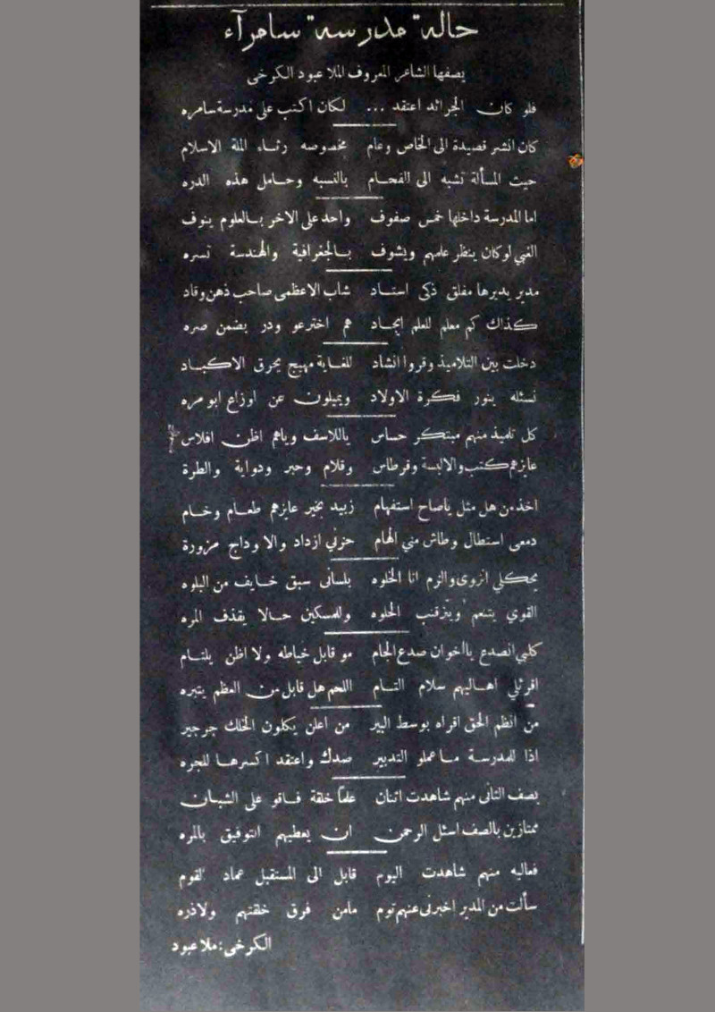 حالة مدرسة سامرآء يصفها الشاعر المعروف الملا عبود الكرخي.