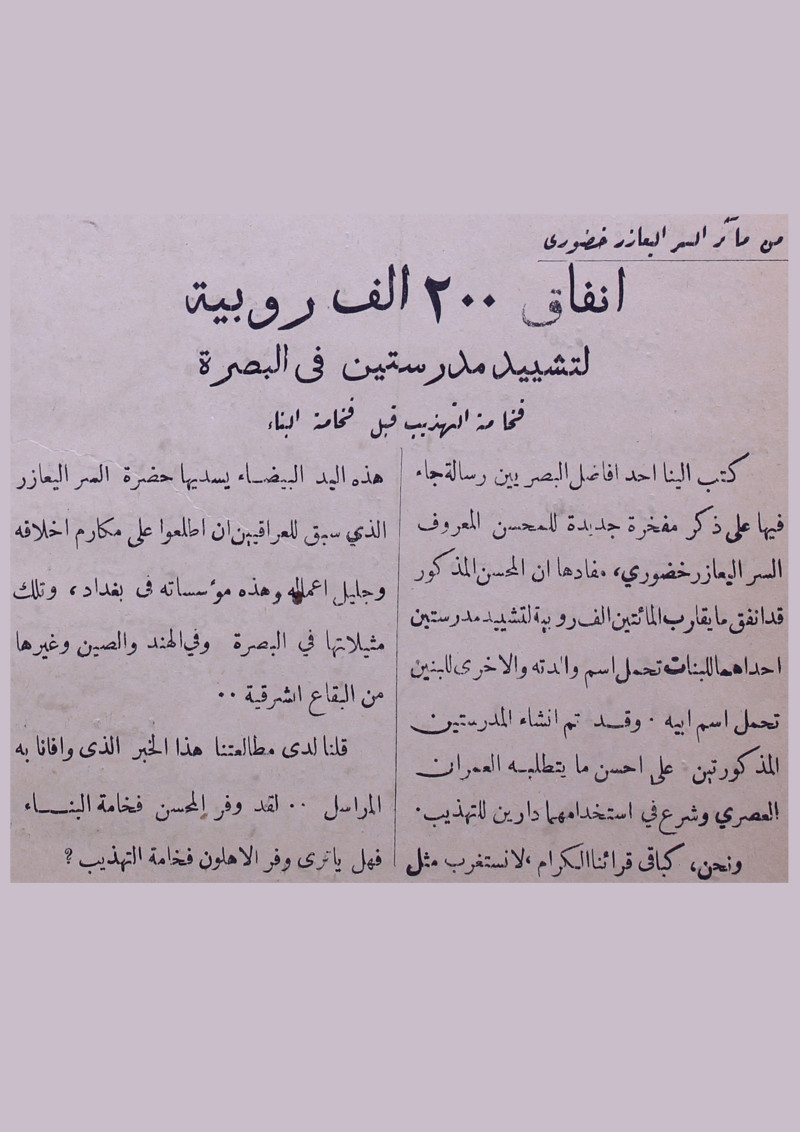 انفاق 200 الف روبية لتشييد مدرستين في البصرة فخامة التهذيب قبل فخامة البناء.