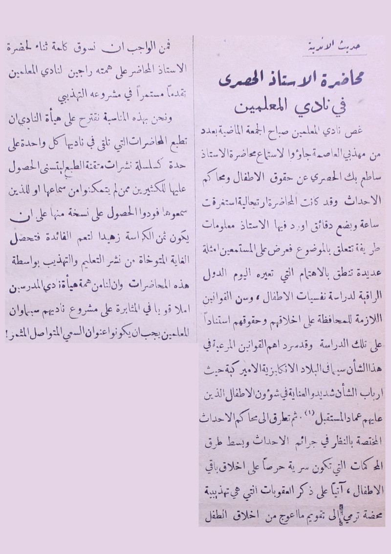 محاظرة الاستاذ الحصري في نادي المعلمين.