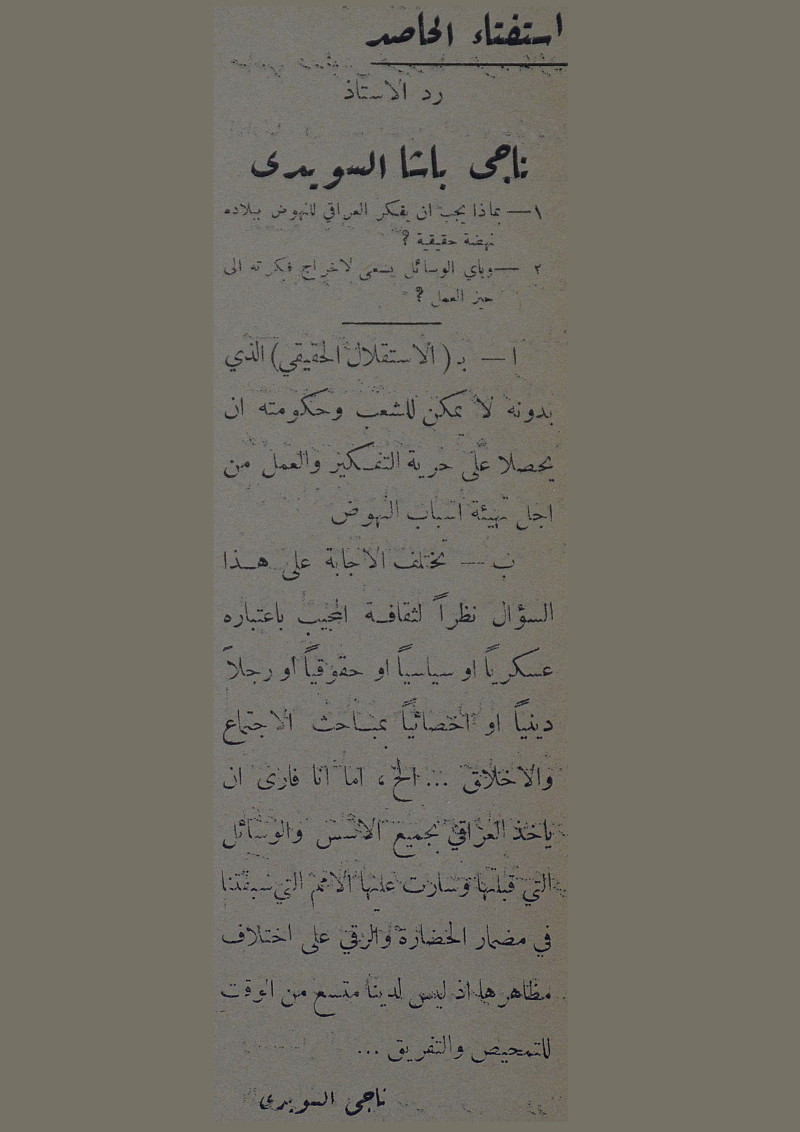 استفتاء الحاصد : رد الاستاذ ناجى باشا السويدى : 1- بماذا يجب ان يفكر العراقي للنهوض ببلاده نهضة حقيقية : 2- وبأي الوسائل يسعى لاخراج فكرته الى حيز العمل.