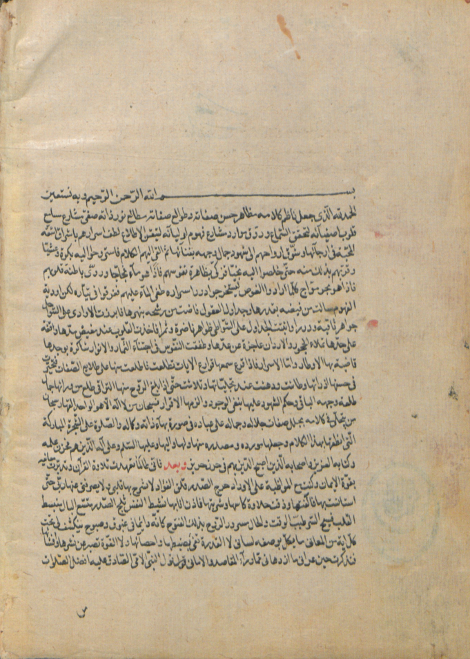 أوله : الحمد لله الذي جعل ناظم كلامه مظاهر حسن صفاته، وطوالع صفاته مطالع نور ذاته، صفى مشارع مسامع قلوب اصفيائه لتحقيق...