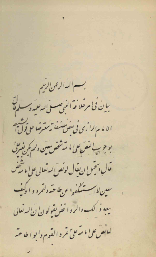 $aأّوله : بيان في امر خلافة النبي صلى الله عليه وسلم. قال الامام الرازي في بعض مصنفاته معترضًا على قول الشيعة.. فايدة في تعيين موضوع الخلافة الكبرى بعد رسول الله ببراهين عقلية مستفادة من...