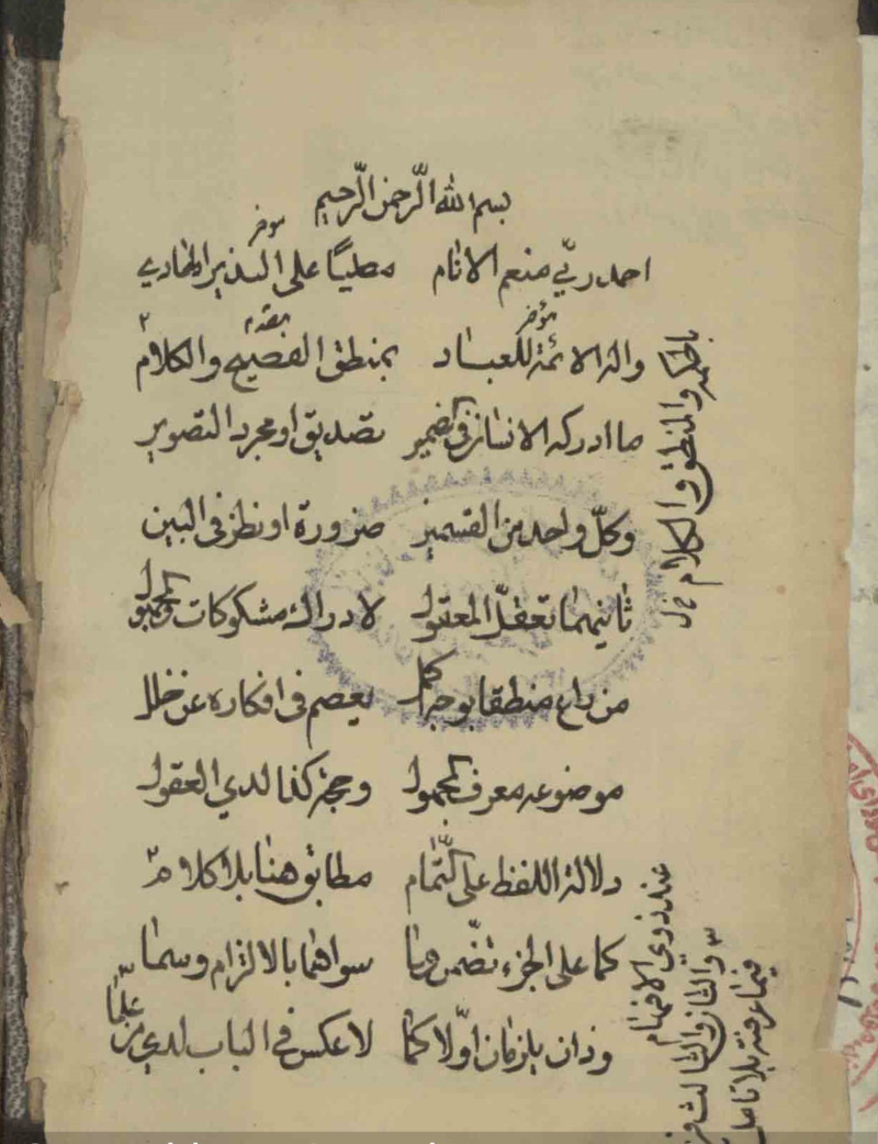 اوله : احمد ربي منعم الانام * مصليًا على النذير الهادي * واله الائمة للعباد * بمنطق الفصيح والكلام * ما أدركه الانسان في الضمير...