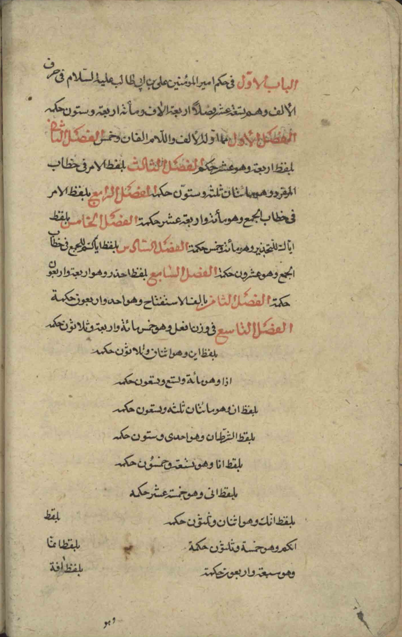 اوله ناقص : ..الباب الاول : في حكم امير المؤنين علي بن ابي طالب عليه السلام في حرف الالف وهي تسعة عشر فصلًا اربعة...