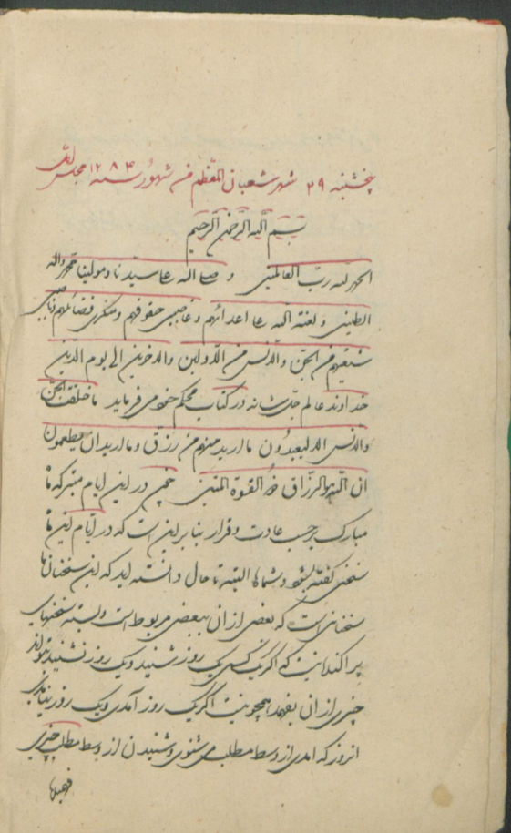 اوله : الحمد لّله رّب العالمين، وصّلى الّله على سّيدنا ومولانا محّمد وآله الطّيبين ، ولعنة الّله على أعدائهم وغاصبي حقوقهم ومنكري فضائلهم وناصبي.