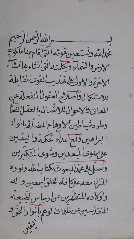 $aاوله : نحمد الّله تعالى ونستعينه بقّوته ، التي أقام بها ملكوت الأرض والسماء وبكلمته، التي أنشأ بها نشأتين الآخرة والُأولى على تهذيب القوى والسماء بكلمته، التي أنشأ بها نشأتين الآخرة والُأولى على تهذيب القوى...