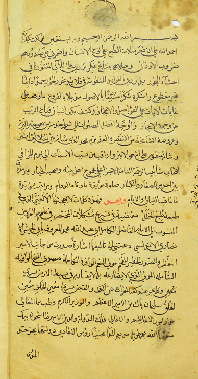 اوله : أحمد الله على أن قصر سلامة الطبع على نوع الانسان، وأضمر في طي صدورهم ضروب الاوزان، وحلاهم بنتائج فك تزري على اللآلي المنثورة.