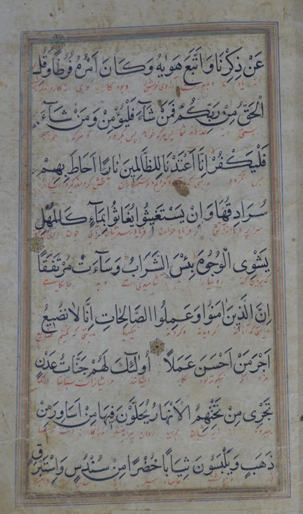أّوله ناقص : عن ذكرنا واتبع هواه وكان امره فرطا * وقل الحمد من ربكم فمن شاء فليؤمن ومن شاء فليكفر إنا أعتدنا للظالمين نارًا.