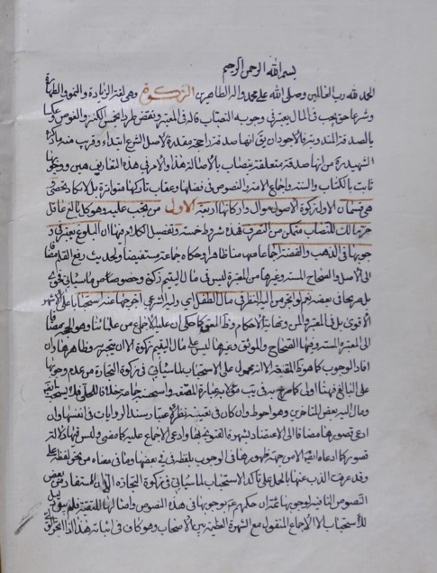 أّوله : الحمد لله رب العالمين... الزكاة وهي لغة الزيادة والنمو والطهارة، وشرعًاحق يجب في المال يعتبر في وجوبه النصاب، قاله في المعتبر...