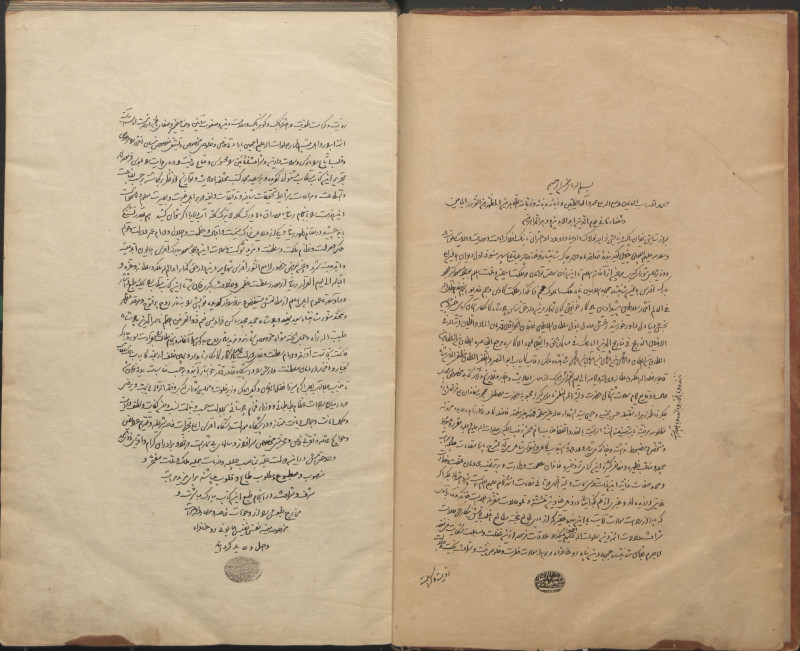 $bعليها أختام المؤّلف مكتوب فيها : «مشى أفخم عّباس قلي ابن محّمد تقي لسان الملك ابن محّمد علّي بن رفيع الدولة بن محّمد علّي بن محّمد رضا عضد الدولة الشريف» وختم آخر : « سپهر أعظم وزير تأليفات ».