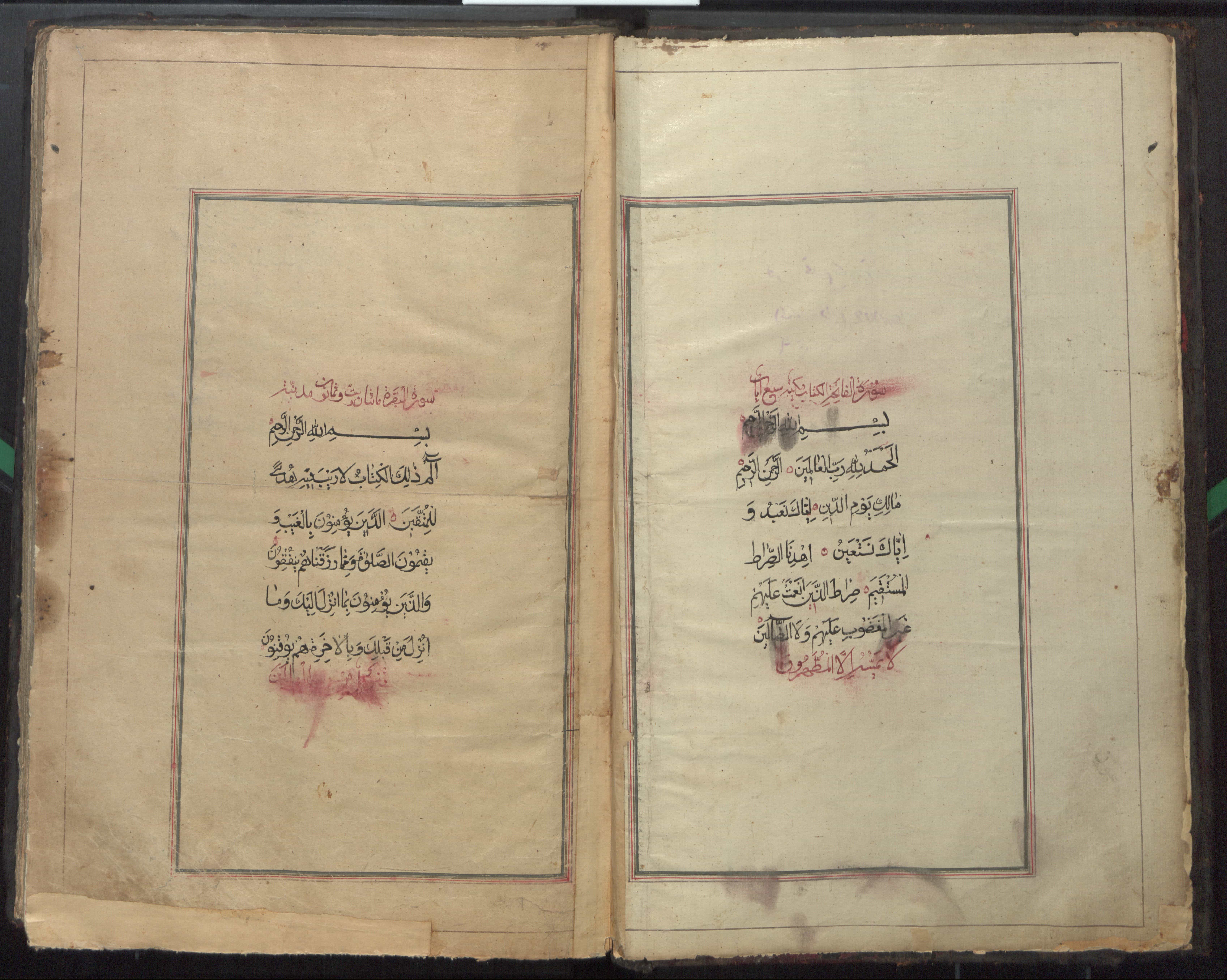 مجدولة بعدة الوان، أسماء الِّسور وعدد اياتها كتبت بالمداد الأحمر داخل مستطيل، الفواصل بين الآيات رسمت على شكل دائرة حمرا، علامات الوقف كتبت بالمداد الاحمر.
