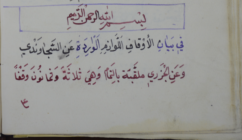 أّوله : في بيان الاوقاف اللوازم الواردة عن السجاوندي وعن الجزري ملقبة بالتمام. وهي ثلاثة وثمانون وقفًا على المتفق عليه ايضًا عن المشايخ...