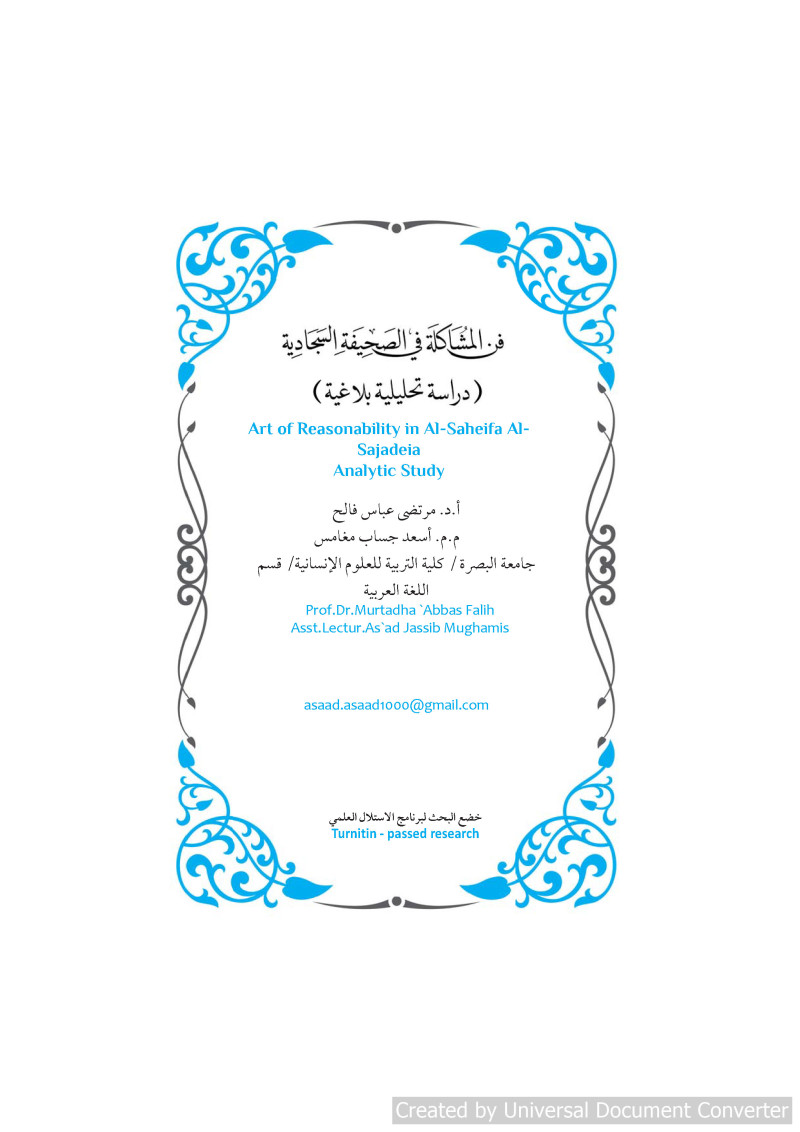 $aفن المشاكلة في الصحيفة السجادية : $b(دراسة تحليلية بلاغية) = Art of Reasonability in Al-Saheifa Al-Sajadeia : Analytic Study / $cأ. د. مرتضى عباس فالح، م. م. اسعد جساب مغامس.