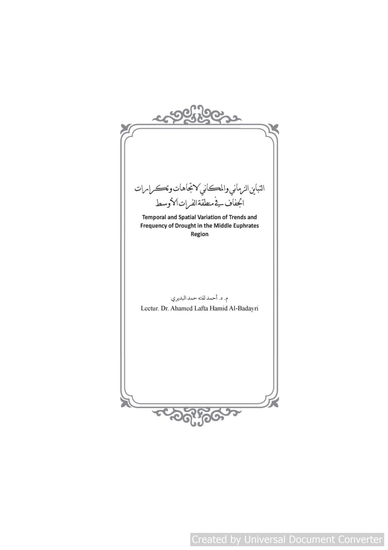 التباين الزماني والمكاني لاتجاهات وتكرارات الجفاف في منطقة الفرات الاوسط = Temporal and Spatial Variation of Trends and Frequency of Drought in the Middle Euphrates Region / م.د. احمد لفته حمد البديري.