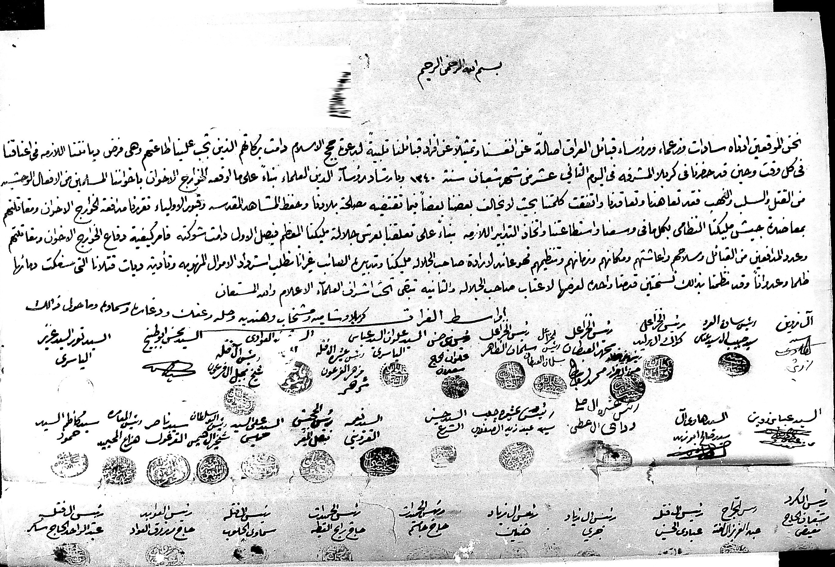 [سادات وزعماء ورؤساء قبائل العراق في اواسط الفرات من كربلاء وشامية ومشخاب وهندية وحله وعفك ودغارة وسماوة وما حول ذلك في كربلاء من اجل دعوة حجج الاسلام بسبب ما فعله الخوارج الاخوان في العتبات المقدسة من تخريب]