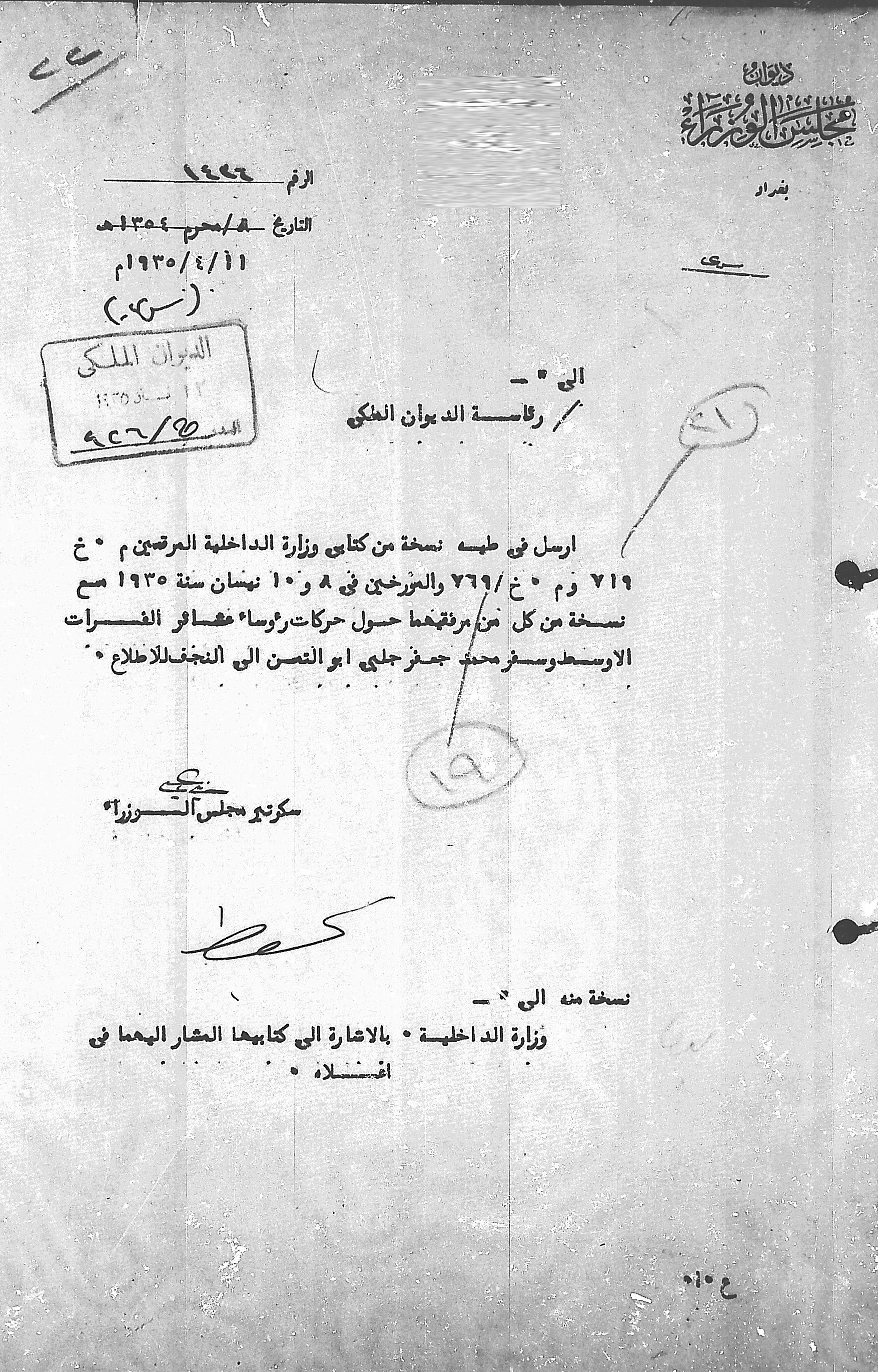 [حركات رؤساء عشائر الفرات الاوسط وسفر محمد جعفر جلبي ابو التمن الى النجف]