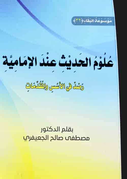علوم الحديث عند الامامية رصد في الاسس والمقدمات : وهو محاولة للوقوف على كتاب منهجي في (علوم الحديث) عبر قراءة مفاهيمة ومقدماته من وجهة نظر مدرسة الامامية / بقلم الدكتور مصطفى صالح الجعيفري.