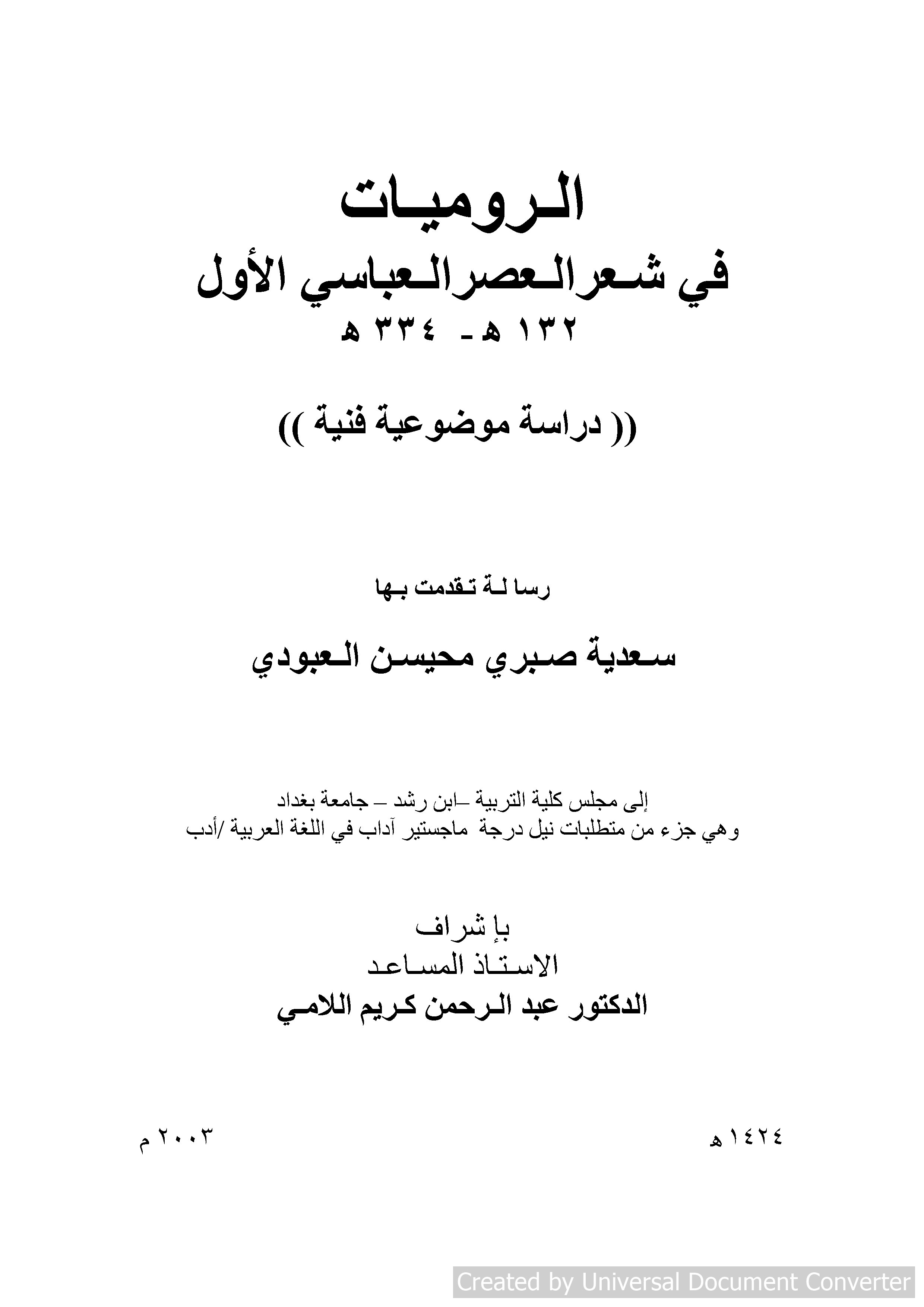 الروميات في شعر العصر العباسي الاول 132 ﻫ - 334 ﻫ :