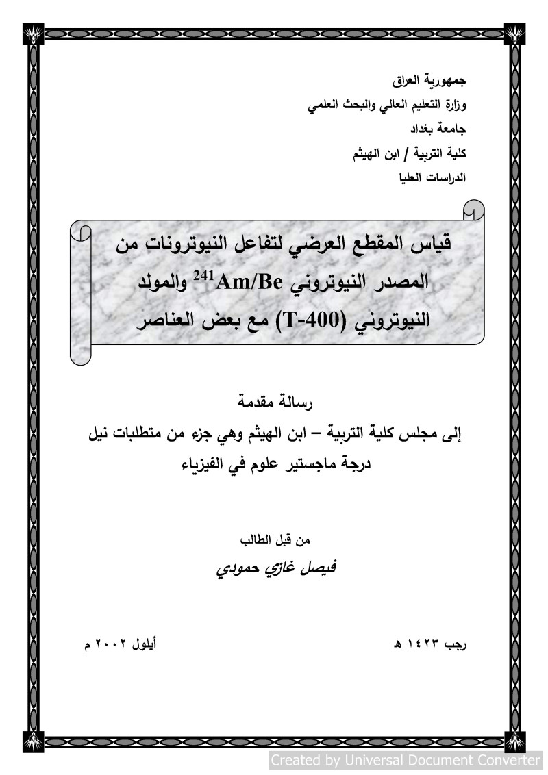 قياس المقطع العرضي لتفاعل النيوترونات من المصدر النيوتروني 241Am/Be والمولد النيوتروني (T-400) مع بعض العناصر = The Measurement of Cross-Section for the Reaction of Neutrons from 241Am/Be Source and Neutron Generator (T-400) with some Elements / من قبل الطالب فيصل غازي حمودي.