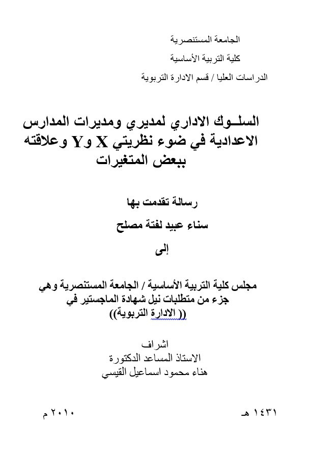 السلوك الاداري لمديري ومديرات المدارس الاعدادية في ضوء نظريتي X وY وعلاقته ببعض المتغيرات / رسالة تقدمت بها سناء عبيد لفتة مصلح ؛ اشراف الاستاذ المساعد الدكتورة هناء محمود اسماعيل القيسي.