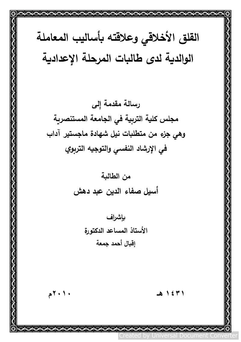 القلق الأخلاقي وعلاقته بأساليب المعاملة الوالدية لدى طالبات المرحلة الإعدادية = Moral Anxiety and its Relation with parents treatment Styles of secondary School students / من الطالبة أسيل صفاء الدين عبد دهش ؛ بإشراف الأستاذ المساعد الدكتورة إقبال أحمد جمعة.