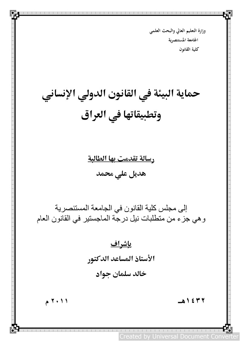$aحماية البيئة في القانون الدولي الإنساني وتطبيقاتها في العراق : $bThe Protection Of Environment In The International Humanitarian Law And Its Application In Iraq / $cهديل علي محمد ؛ بإشراف الأستاذ المساعد الدكتور خالد سلمان جواد.