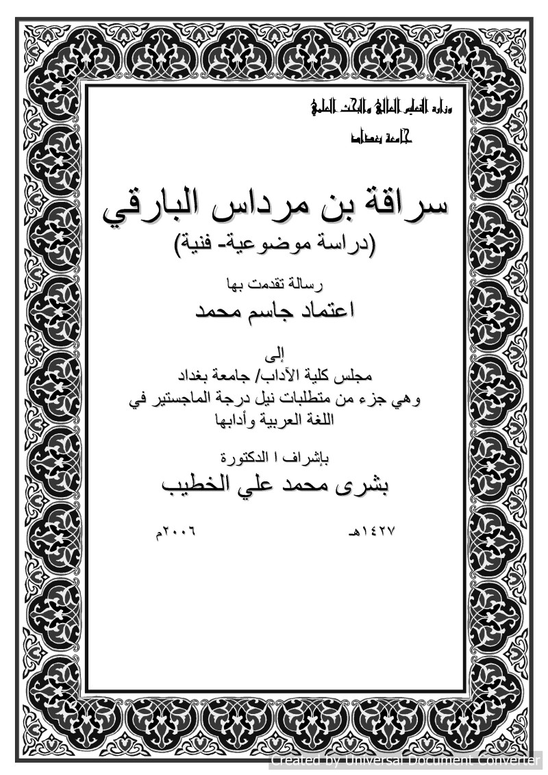 سراقة بن مرداس البارقي : دراسة موضوعية- فنية = Suraqa Ibn Mirdass al-Bariqi : An Artistic- Objective Study / رسالة تقدمت بها اعتماد جاسم محمد ؛ إشراف الدكتورة بشرى محمد علي الخطيب.