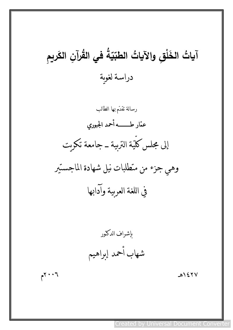 آيات الخلق والآيات الطبية في القرآن الكريم : دراسة لغوية = Medicine & Creation Verses in Holley Qura`n : Linguistically Study / رسالة تقّدم بها الطالب عمار طه أحمد الجبوري ؛ إشراف شهاب أحمد إبراهيم.