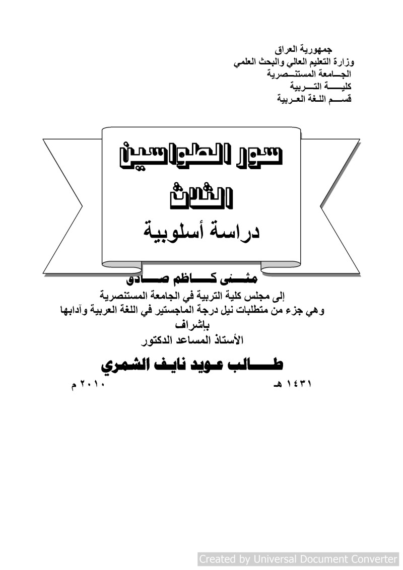 سور الطواسين الثلاث : دراسة أسلوبية = The Three Suras of Ta' Sen : A Stylistic Study / تقدم بها مثنى كاظم صادق ؛ بإشراف الأستاذ المساعد الدكتور طالب عـويد نايـف الشمري.