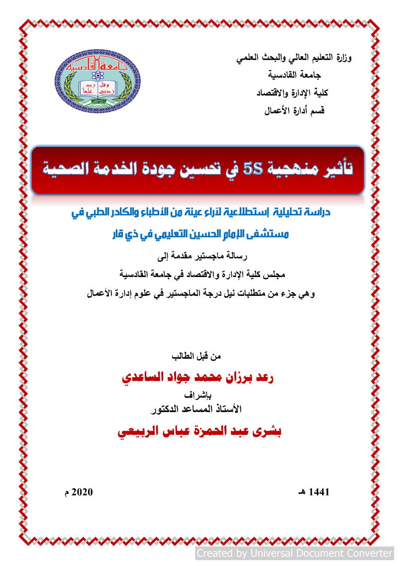 تأثير منهجية 5s في تحسين جودة الخدمة الصحية : دراسة تحليلية استطلاعية لآراء عينة من الاطباء والكادر الطبي في مستشفى الامام الحسين التعليمي في ذي قار = Impact Methodology 5S in Improve Service Quality Health : An exploratory analytical study of the opinions of a sample of doctors and medical staff at Imam Hussain Teaching Hospital in Thi Qar / رعد برزان محمد جواد الساعدي ؛ باشراف الاستاذ المساعد الدكتور بشرى عبد الحمدزة عباس الربيعي.