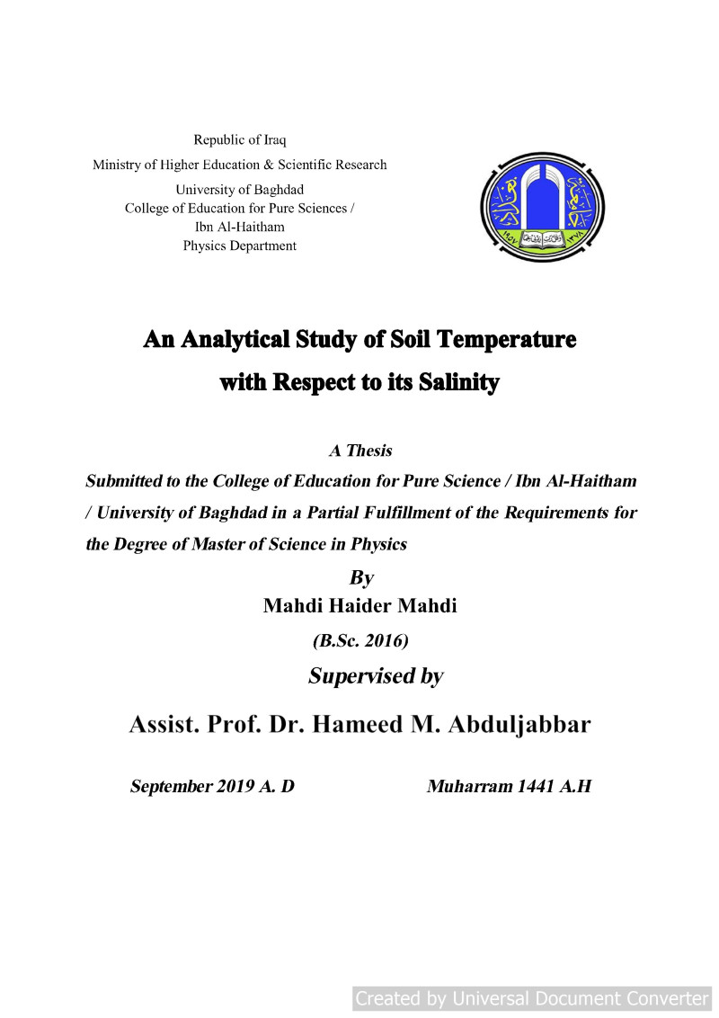 An Analytical Study of Soil Temperature with Respect to its Salinity = دراسة تحليلية لدرجة حرارة التربة بالنسبة لملوحتها / by Mahdi Haider Mahdi ; Supervised by Prof. Dr. Hameed M. Abduljabbar.