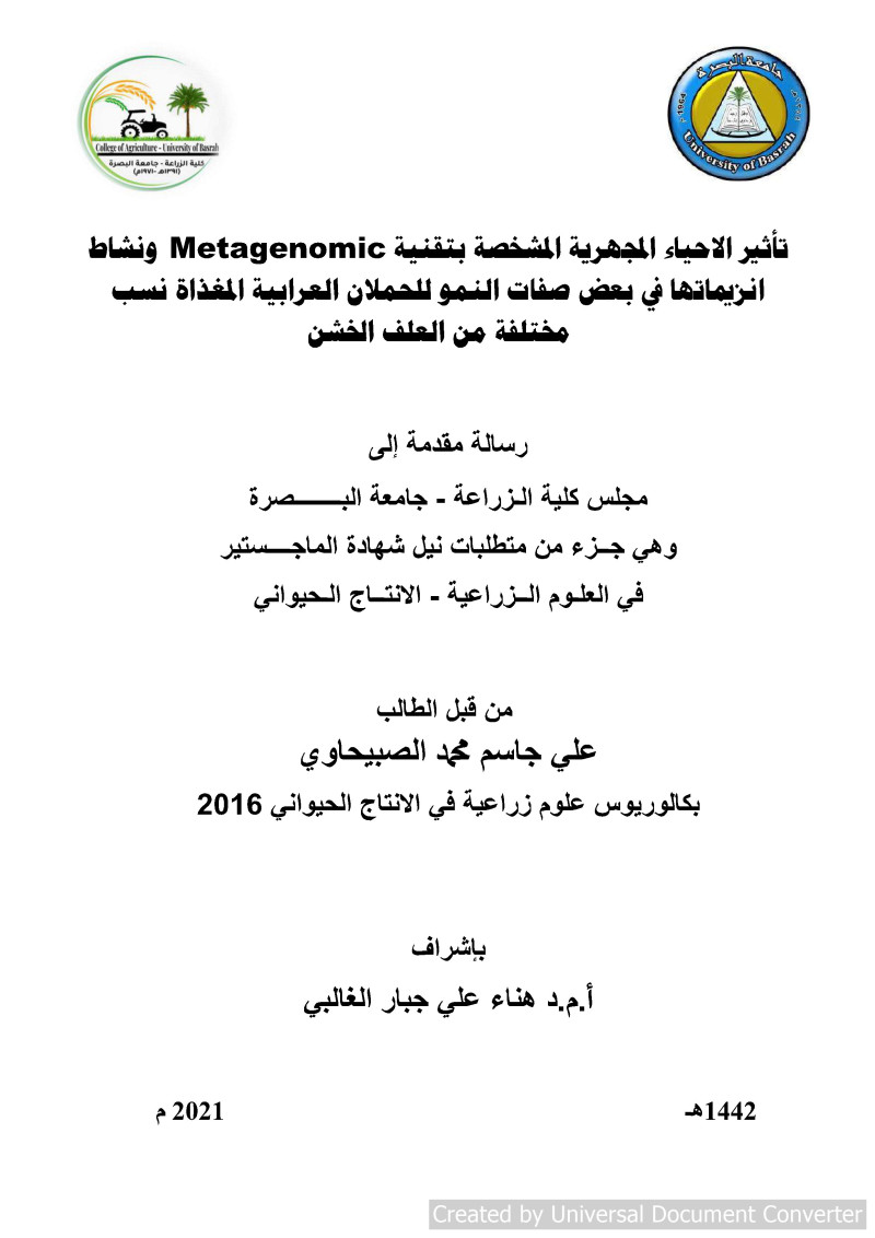 تأثير الاحياء المجهرية المشخصة بتقنية Metagenomic ونشاط انزيماتها في بعض صفات النمو للحملان العرابية المغذاة نسب مختلفة من العلف الخشن = The effect of microorganisms diagnosed by Metagenomic technique and the activity of their enzymes on some growth characteristics of Arabi lambs fed different percentages of roughages / علي جاسم محمد الصبيحاوي ؛ بإشراف هناء علي جبار الغالبي.