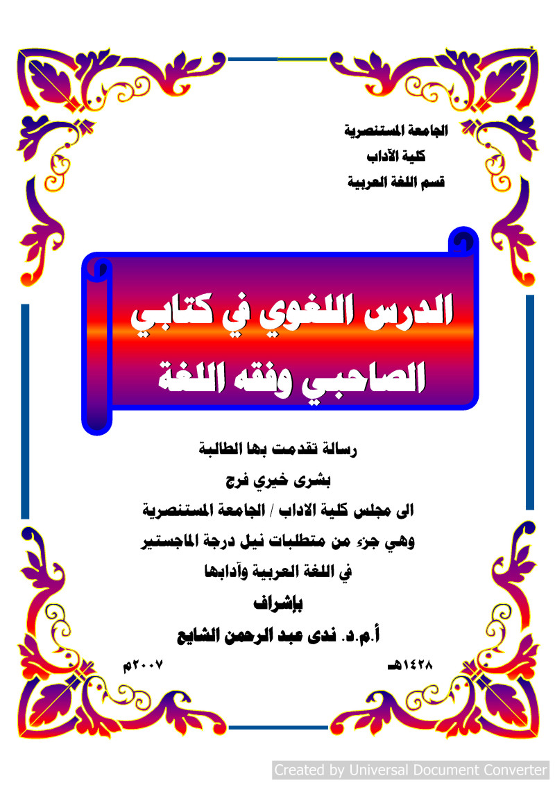 الجامعة المستنصرية (بغداد، العراق). كلية الآداب. قسم اللغة العربية، المؤسسة المانحة للدرجة.