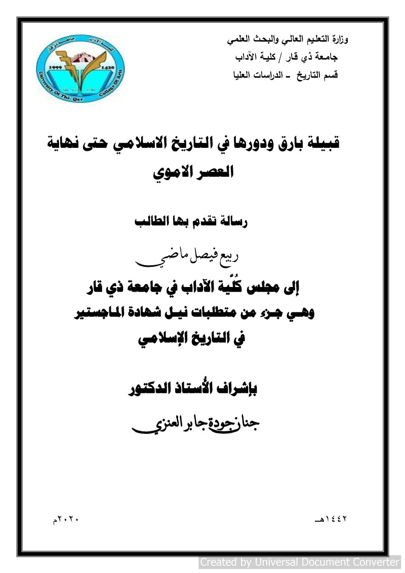 قبيلة بارق ودورها في التاريخ الاسلامي حتى نهاية العصر الاموي = The Bariq tribe and its role in Islamic history until the end of the Umayyad era / رسالة تقدم بها الطالب ربيع فيصل ماضي ؛ بإشراف الأستاذ الدكتور جنان جودة جابر العنزي.