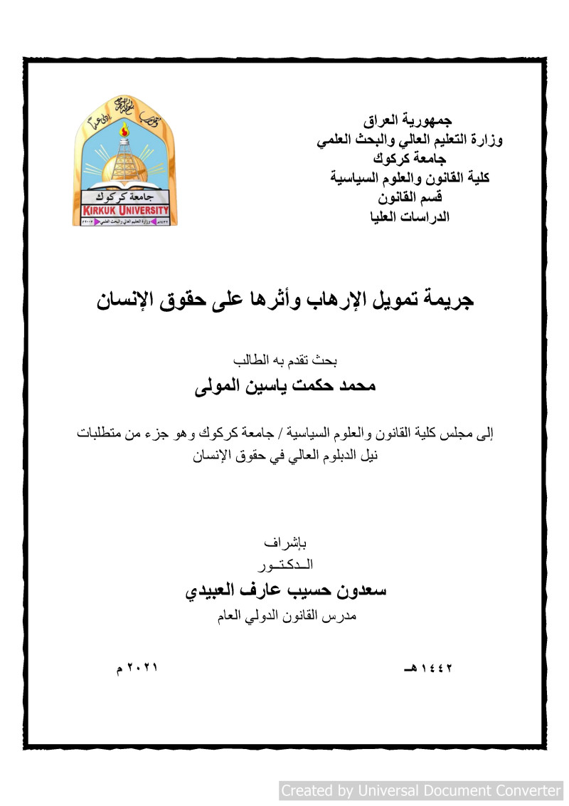 $aجامعة كركوك (العراق). $bكلية القانون والعلوم السياسية. $bقسم القانون، $eالمؤسسة المانحة للدرجة.