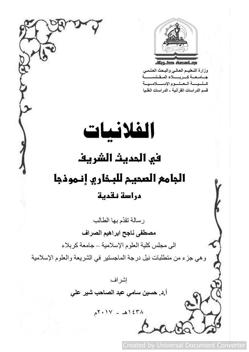 الفلانيات في الحديث الشريف : الجامع الصحيح للبخاري إنموذجا : دراسة نقدية = Al-Fulaniat in the Holy Tradition : Al-Jami'e Al-Saheeh for Al-Bukhary as Example : A Critical Study / مصطفى ناجح ابراهيم الصراف ؛ إشراف أ.د. حسين سامي عبد الصاحب شير علي.