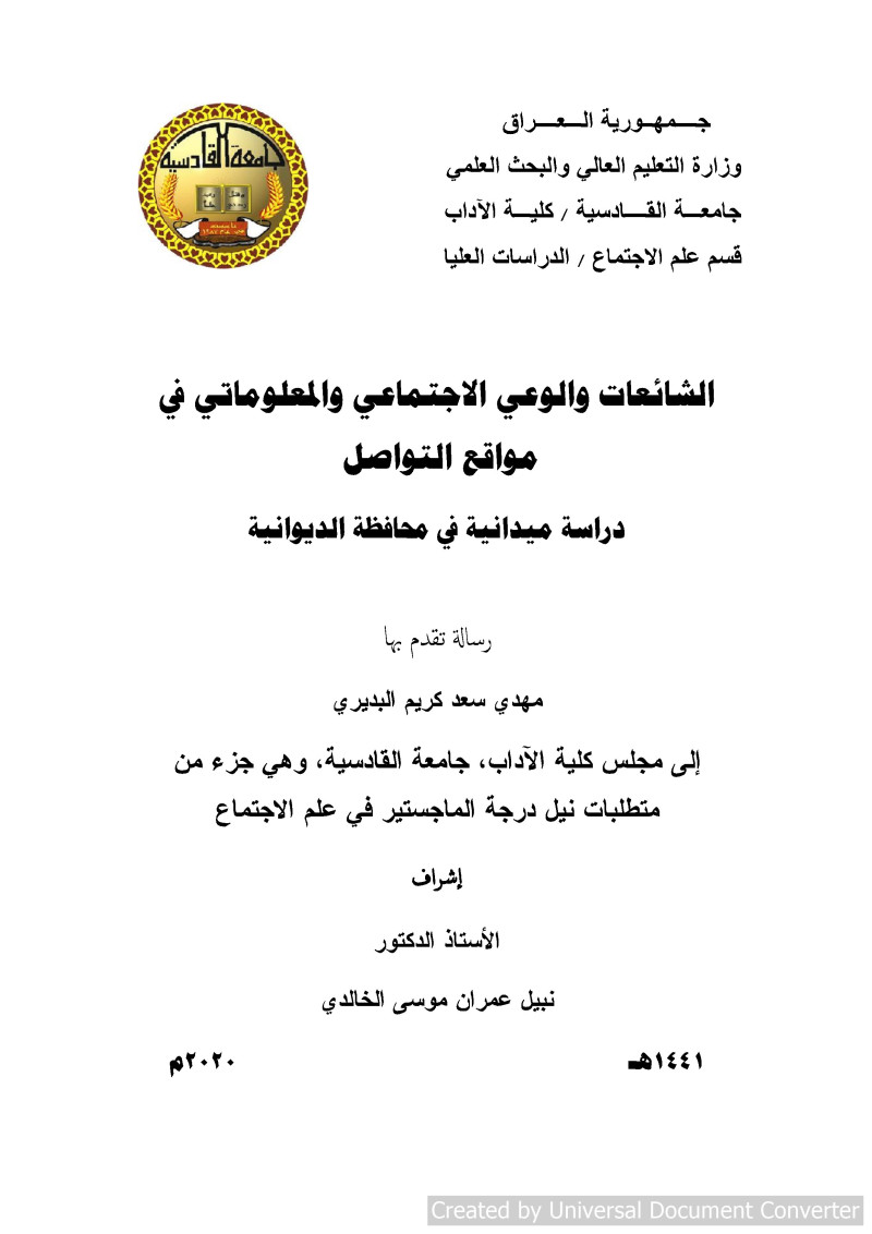 الشائعات والوعي الاجتماعي والمعلوماتي في مواقع التواصل : دراسة ميدانية في محافظة الديوانية = Rumors and social and informational awareness in the communication sites : Field study in Diwaniya city / مهدي سعد كريم البديري ؛ الأستاذ الدكتور نبيل عمران موسى الخالدي.