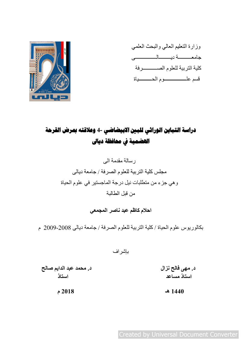 $aجامعة ديالى (العراق). $bكلية التربية للعلوم الصرفة. $bقسم علوم الحياة، $eالمؤسسة المانحة للدرجة.