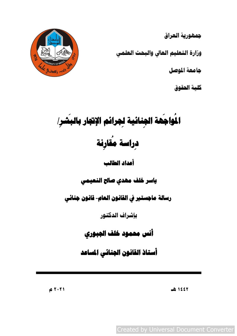 المواجهة الجنائية لجرائم الإتجار بالبشر : دراسة مقارنة = Criminal confrontation with the crime of human trafficking : acomparative study / إعداد الطالب ياسر خلف مهدي صالح النعيمي ؛ بإشراف الدكتور أنس محمود خلف الجبوري.
