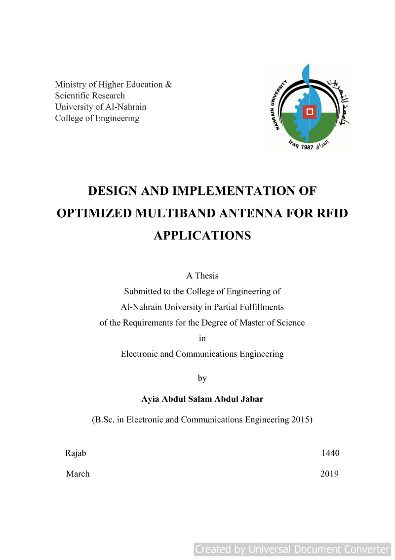 DESIGN AND IMPLEMENTATION OF OPTIMIZED MULTIBAND ANTENNA FOR RFID APPLICATIONS = تصميم وتنفيذ هوائي مثالي متعدد الاغراض لتطبيقات تمييز الاشارات الراديوية / Ayia Abdul Salam Abdul Jabar ; Dhirgham Kamal Naji.