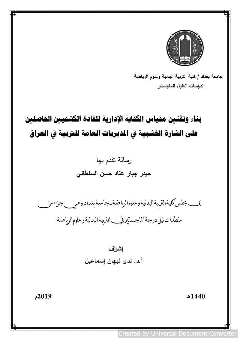 بناء وتقنين مقياس الكفاية الادارية للقادة الكشفيين الحاصلين على الشارة الخشبية في المديريات العامة للتربية في العراق = Constructing and standardizing the administrative competence standard for Scout leaders who have the wooden badge at the General Directorate of Education in Iraq / رسالة تقدم بها حيدر جبار عناد حسن السلطاني ؛ إشراف أ. د. ندى نبهان إسماعيل.