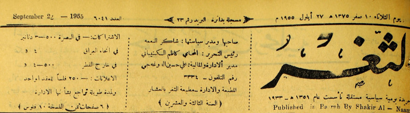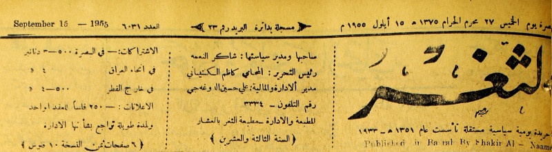 جريدة يومية سياسية عامة = AL-Thaghr : A Daily Newspaper