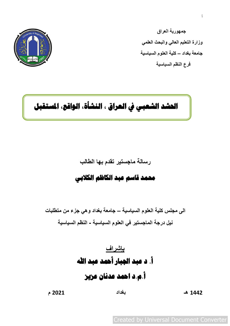 الحشد الشعبي في العراق : النشأة، الواقع، المستقبل = POPULAR MOBILIZATION IN IRAQ : ORIGIN, REALITY, FUTURE / محمد قاسم عبد الكاظم الكلابي ؛ باشراف أ. م. د عبد الجبار احمد عبد الله، أ.م . د احمد عدنان عزيز.