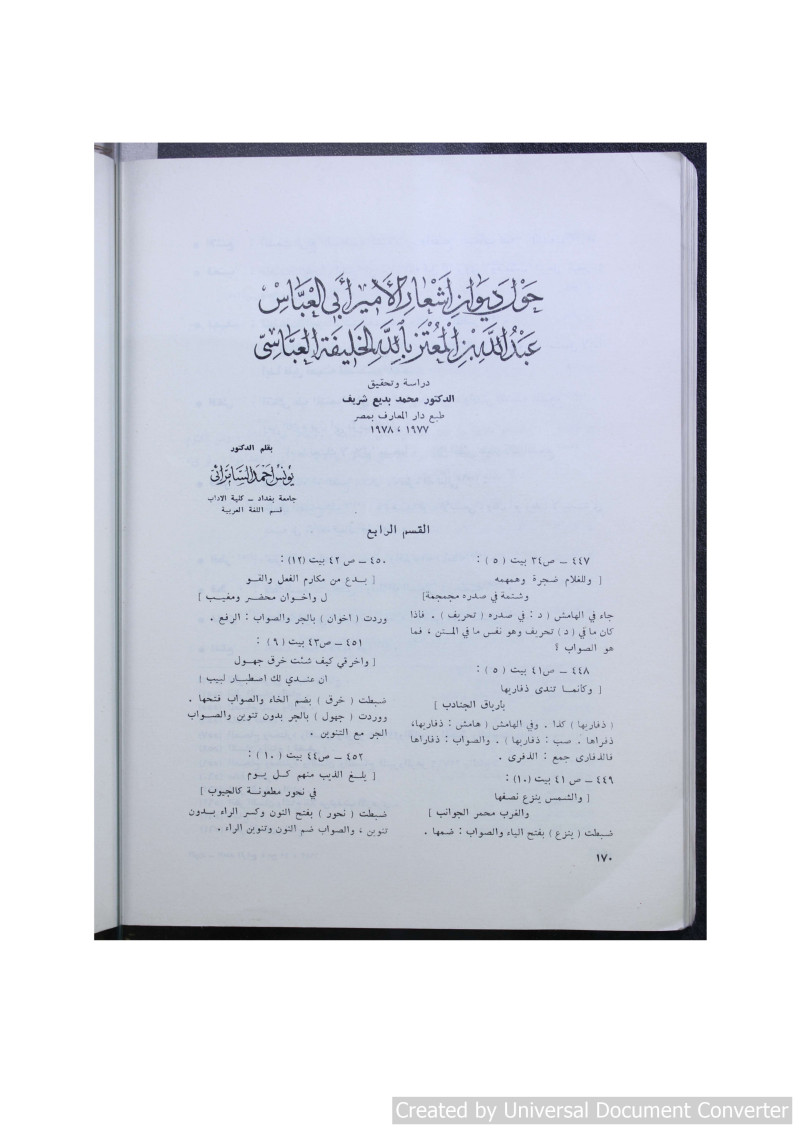 حول ديوان اشعار الامير ابي العباس عبد الله بن المعتز بالله الخليفة العباسي دراسة وتحقيق الدكتور محمد بديع شريف. القسم الرابع / بقلم الدكتور يونس احمد السامرائي.