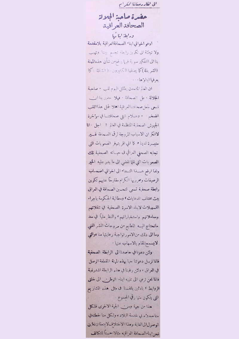 حضرة صاحبة الجلالة : الصحافة العراقية ورابطة ابنائها.
