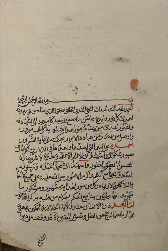 أوله : الحمد لله مالك الملك الحق القدير الخالق للخلق الذي اضاء من نوره مدده الهدى كل نور، وابدع واتقن ما صنع واوجد كل موجود الى السهادة...