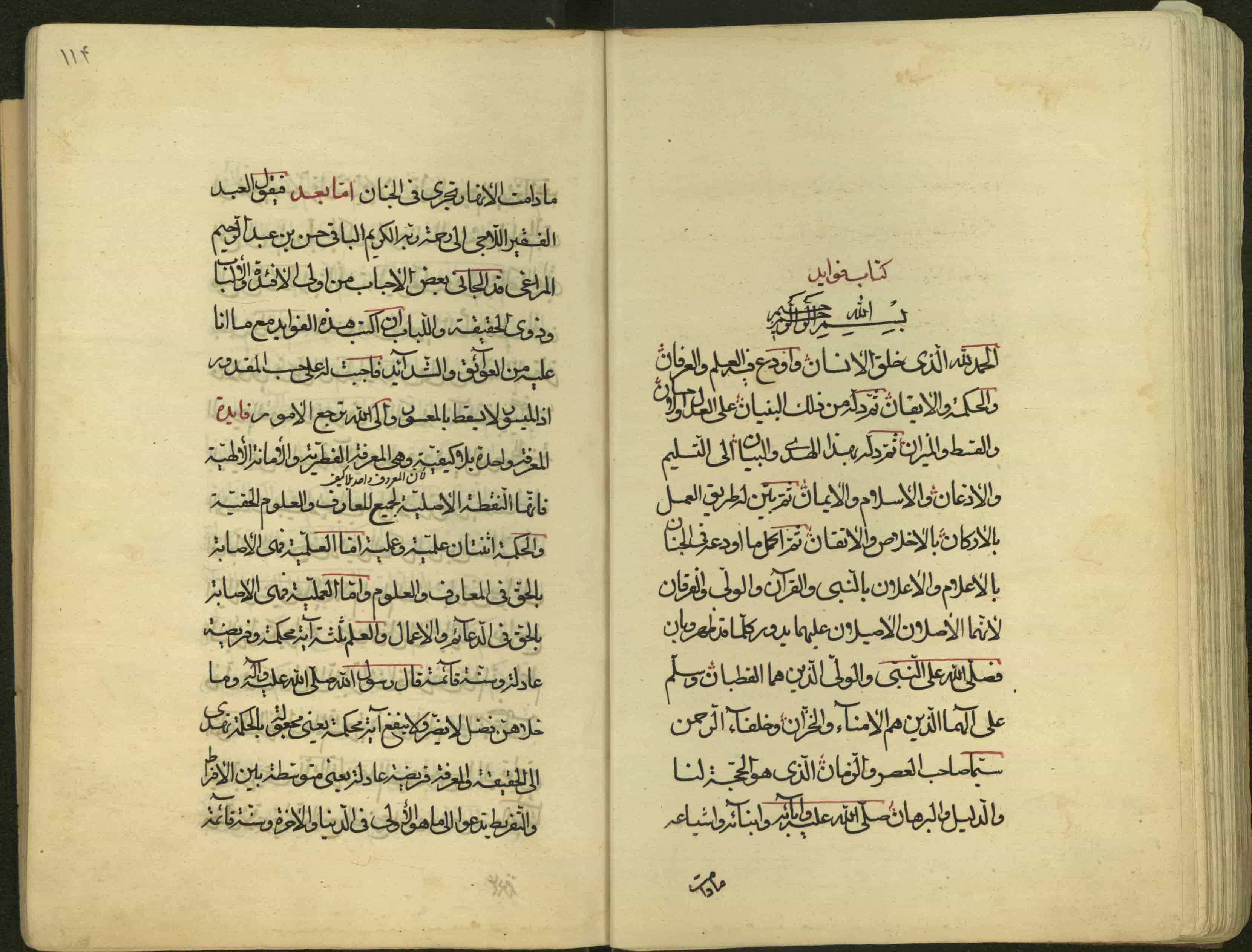 اوله : الحمد لله الذي خلق الانسان واودع فيه العلم والعرفان والحكمة والايقان ثم دله من ذلك البنيان على العدل والاحسان...