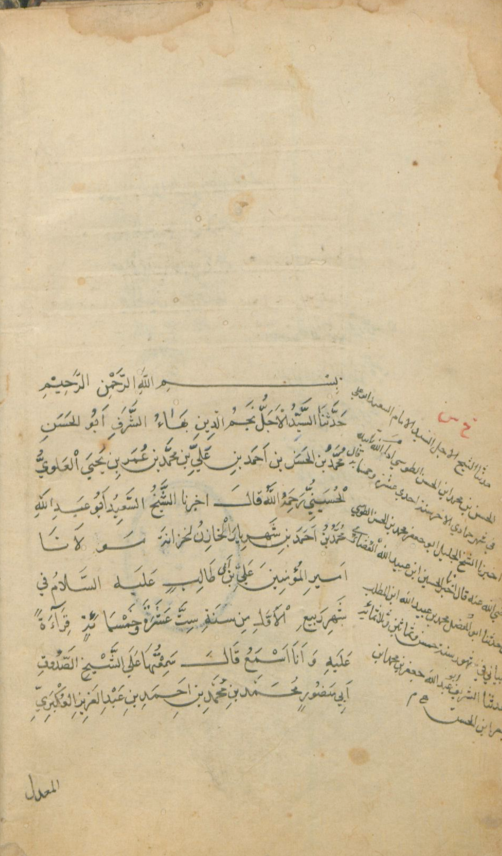 أوله : حدثنا السيد الاجل نجم الدين بهاء الشرف ابو الحسن محمد بن الحسن بن احمد بن علي بن محمد بن عمر بن يحيى العلوي الحسيني رحمه الله.