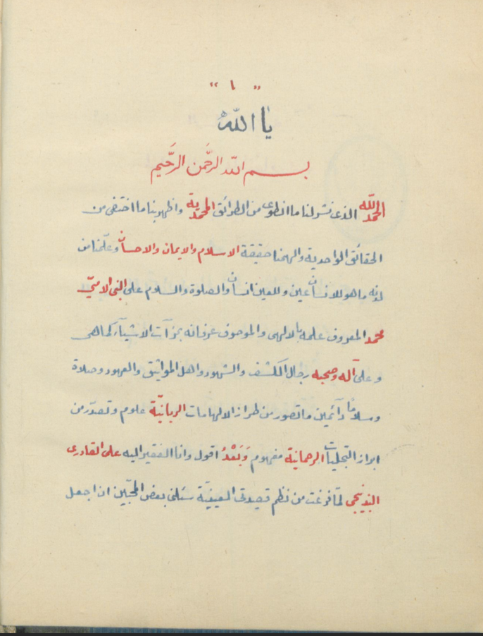 $aأّوله : الحمد لّله الذي نشر لنا ما انطوى من الطرائق المحّمدّية ، وأظهر بنا ما اختفى من الحقائق الواحدّية ، وألهمنا حقيقة الإسلام والإيمان والإحسان » .