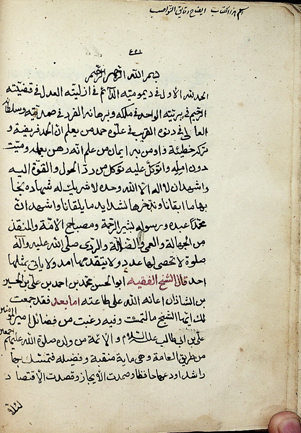 $aأّوله : الحمد لّله الأّول في ديمومّيته ، الدائم في أزلّيته ، العدل في قضّيته ، الرحيم في برّيته ، الواحد في ملكه وبرهانه ، الفرد في صمدّيته وسلطانه...